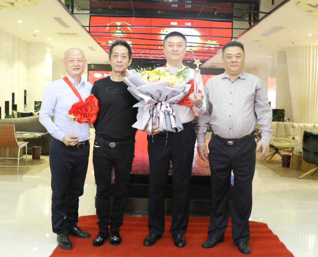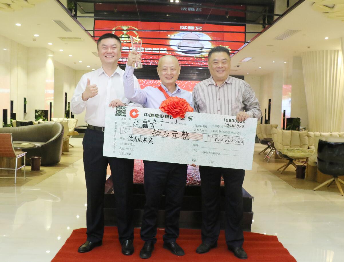 集團常務(wù)副總裁沈雁飛在集團業(yè)務(wù)拓展中做出突出貢獻,被授予優(yōu)秀成果獎,獎勵10萬元。圖為徐凱宏董事長、黃河副董事長與獲獎?wù)吆嫌傲裟睢?br />