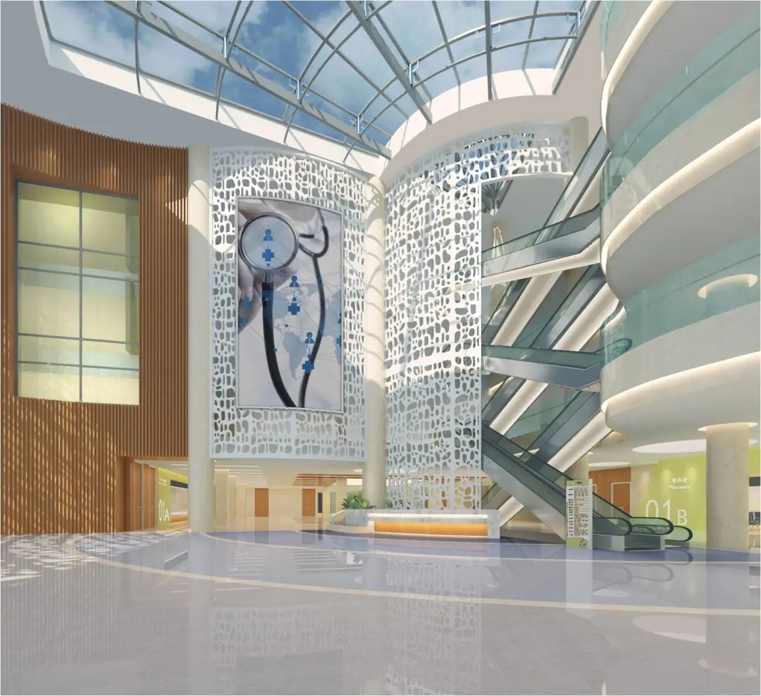 住院大廳天棚采用大面積玻璃采光頂,節(jié)約采光成本的同時(shí)營(yíng)造廣闊的視覺(jué)空間。墻面采用仿石材瓷磚,與石材地面銜接,穿插氟碳烤漆鋼板柱子,通過(guò)對(duì)點(diǎn)線面的梳理,凸顯簡(jiǎn)約、大氣、通透、現(xiàn)代化的視覺(jué)美感。