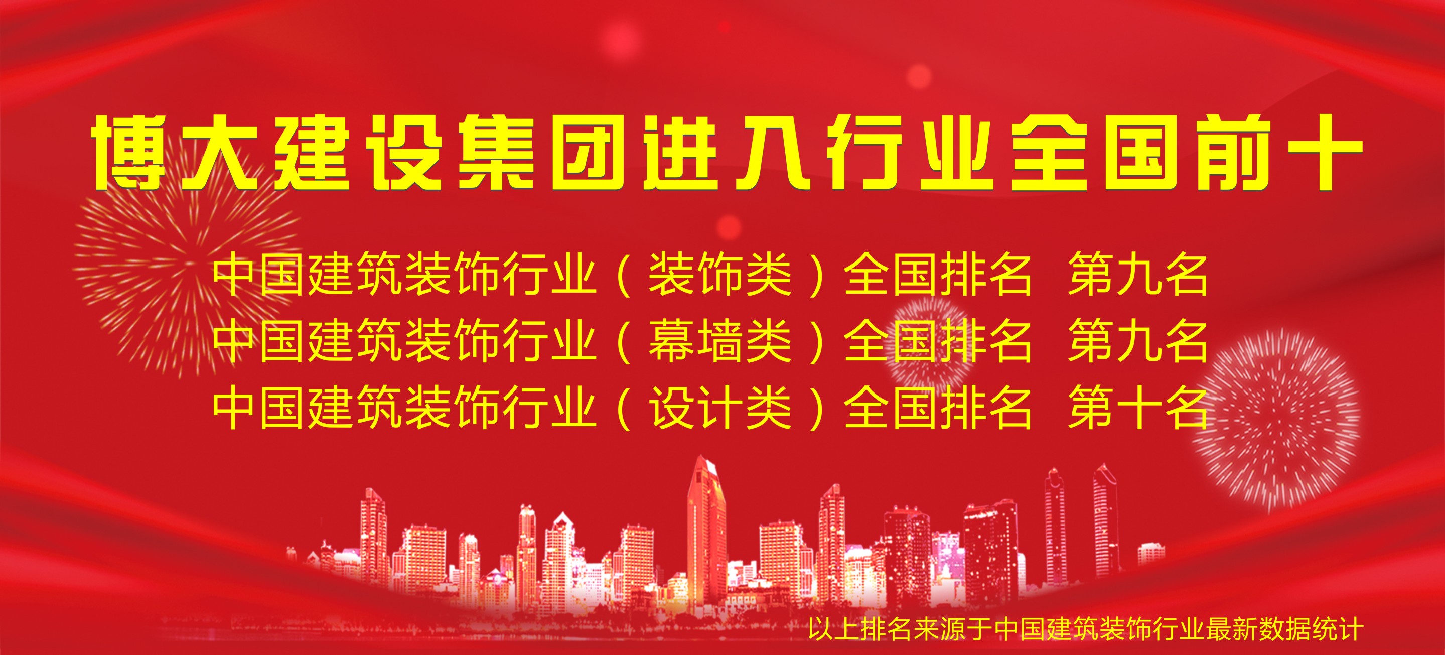 2019年1月9日,中國(guó)建筑工程裝飾頒獎(jiǎng)大會(huì)在北京隆重舉行,根據(jù)中國(guó)建筑裝飾行業(yè)綜合數(shù)據(jù)統(tǒng)計(jì),博大建設(shè)集團(tuán)憑借綜合實(shí)力,以?shī)^進(jìn)姿態(tài)挺進(jìn)行業(yè)全國(guó)前十,其中,裝飾類(lèi)排名全國(guó)第九、幕墻類(lèi)排名全國(guó)第九、設(shè)計(jì)類(lèi)排名全國(guó)第十。