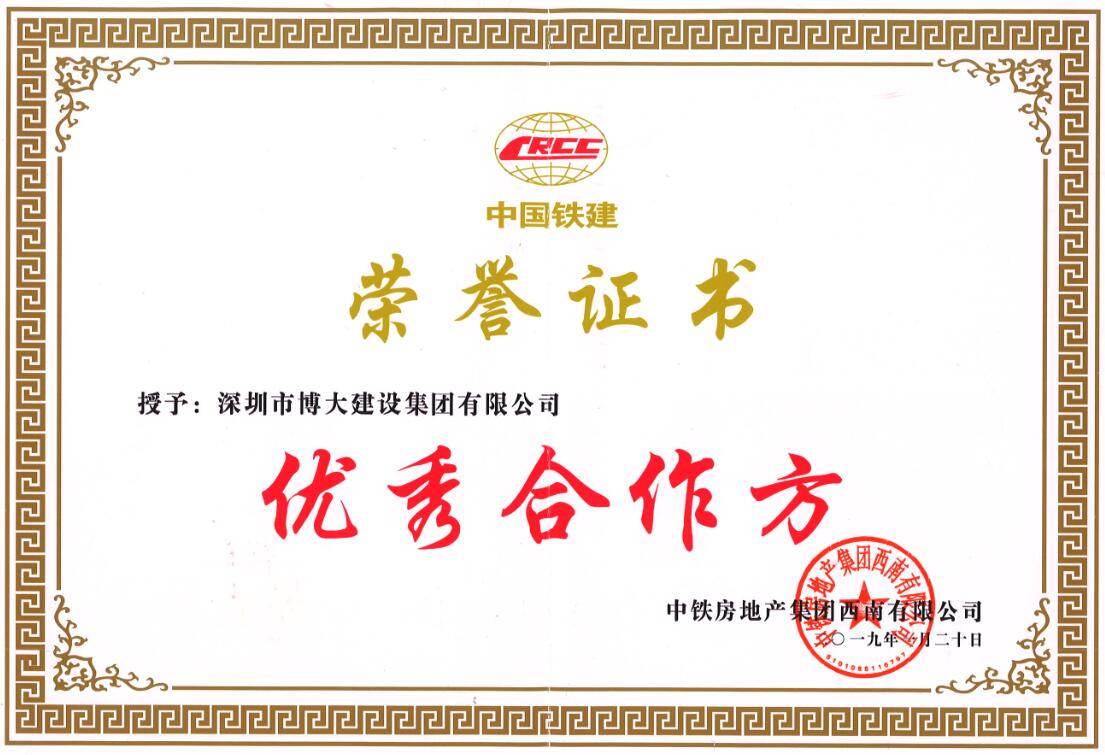 博大建設(shè)集團(tuán)以優(yōu)秀的工程質(zhì)量和準(zhǔn)時(shí)交期,協(xié)助中國(guó)鐵建奠定了西派國(guó)樾精裝大平層的品牌效應(yīng),榮獲中國(guó)鐵建優(yōu)秀合作方。