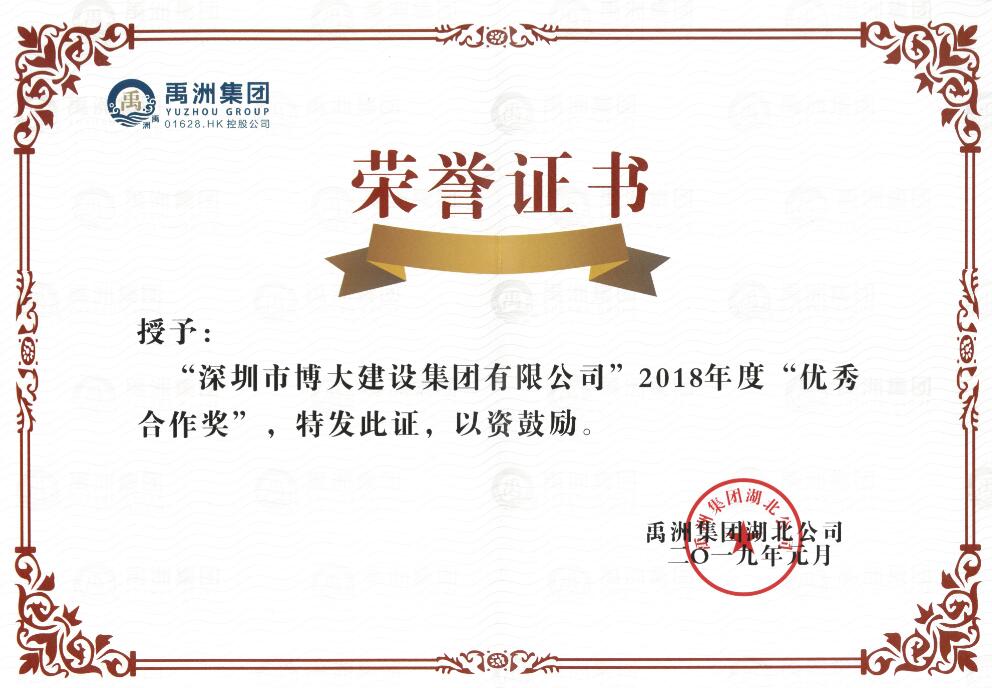 博大建設(shè)集團(tuán)承建了禹洲集團(tuán)湖北公司武漢賽洛城六期的精裝房工程,在武漢百盤(pán)維權(quán)的背景下,博大負(fù)責(zé)的精裝房一次性交房率達(dá)到98.41%,且工程質(zhì)量?jī)?yōu)秀,幫助客戶成功避免了因交期、裝修質(zhì)量而造成的消費(fèi)者維權(quán)風(fēng)波。博大的綜合實(shí)力和用心服務(wù)贏得禹洲集團(tuán)湖北公司的高度認(rèn)可,榮獲2018年度優(yōu)秀合作獎(jiǎng)。