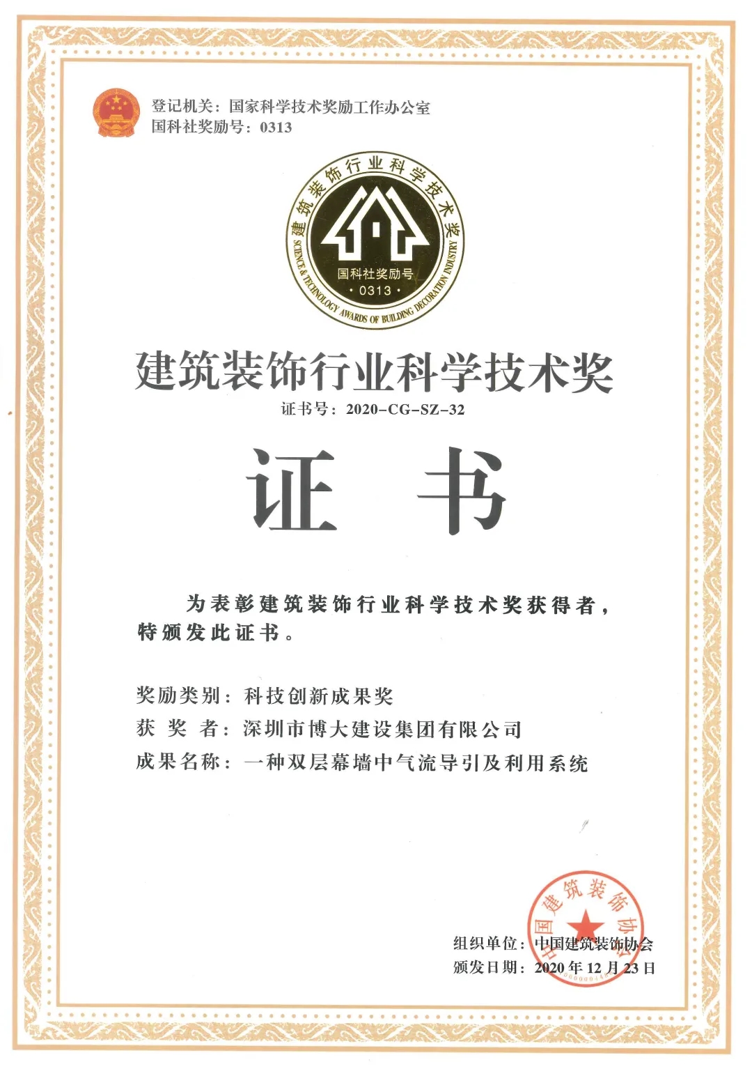 博大研發(fā)的一種雙層幕墻中氣流導(dǎo)引及利用系統(tǒng)創(chuàng)新技術(shù)榮獲二0二0年全國建筑行業(yè)科技創(chuàng)新成果獎。