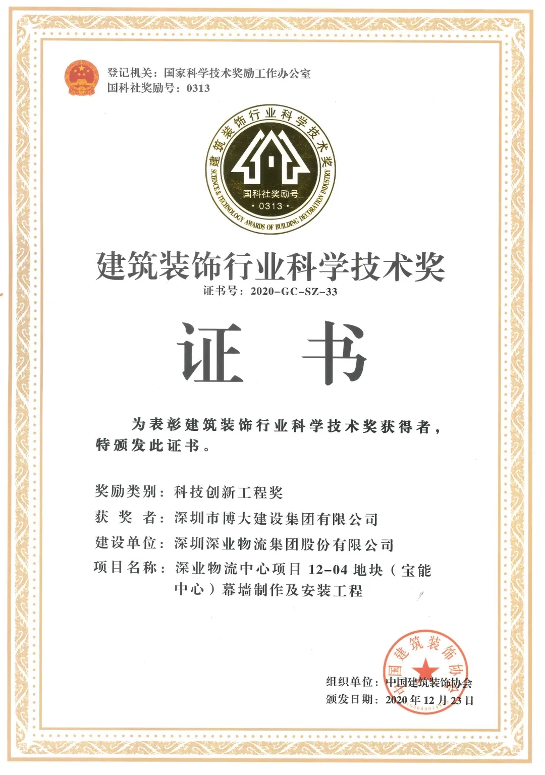 博大建設(shè)集團(tuán)承建的“深業(yè)物流12-04地塊(寶能中心幕墻制作及安裝工程)”榮獲二0二0年全國建筑行業(yè)科技創(chuàng)新工程獎。