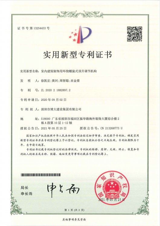 專利成果分別是《室內(nèi)建筑裝飾用環(huán)繞螺旋式頂升調(diào)節(jié)機構(gòu)》、《一種GRG吊頂安裝結(jié)構(gòu)》、《一種PC預(yù)制混凝土構(gòu)件下的特大推拉窗》、《一種帶有支撐構(gòu)件的超大空間頂轉(zhuǎn)換層結(jié)構(gòu)》、《一種單元拼接式鋁板吊頂或裝飾線條》等22項獲得由國家知識產(chǎn)權(quán)局頒發(fā)的專利證書。